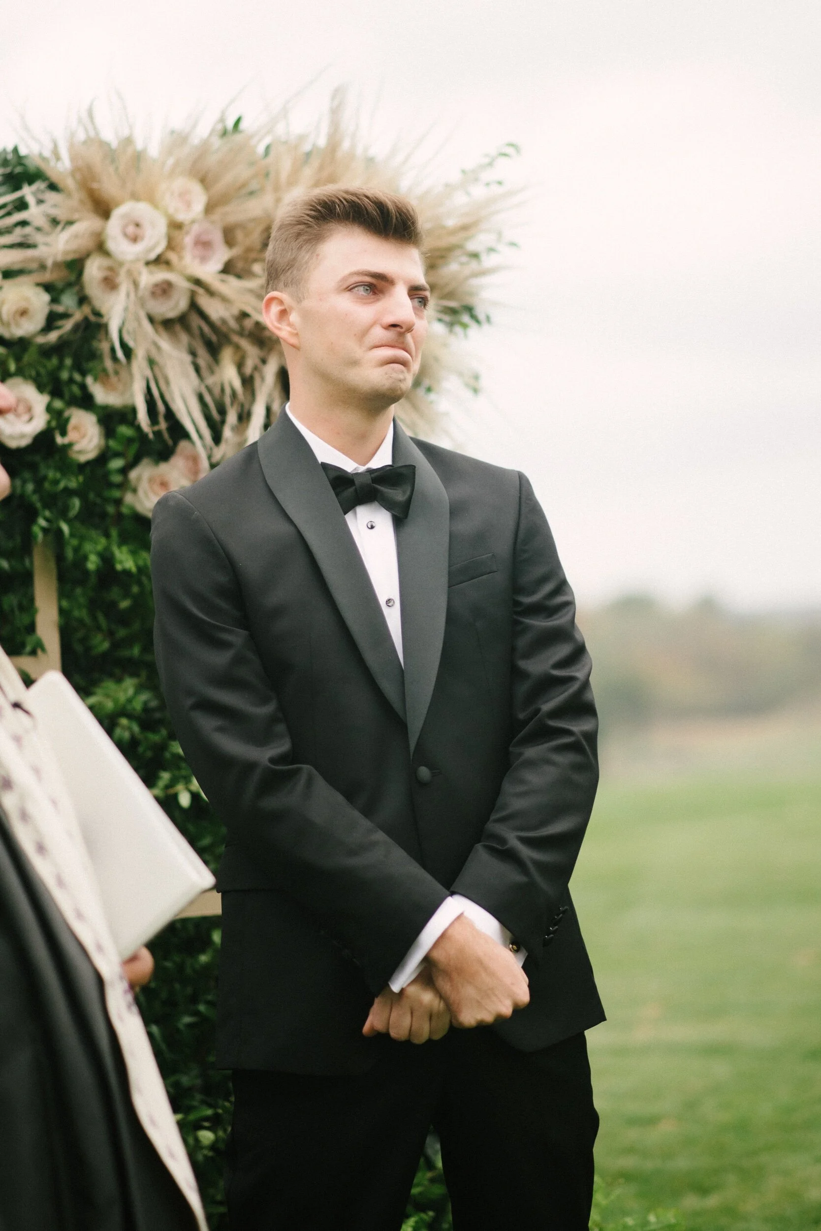 The backdrop for the ceremony was a stunning custom acrylic 3 piece wall sandwiched between two stunning boxwoods, fit with monograms, florals + Pampas grass. After the ceremony, guests moved to the outdoor patio + inside lounge rooms for cocktail hour. With Co-vid measures in place, the main ballroom was opened + guests could remain on the patio or enjoy the ballroom for a cocktail style reception. Lexie + Christian’s Wedding day was simply stunning + SHE was honored to be a part of their love story!