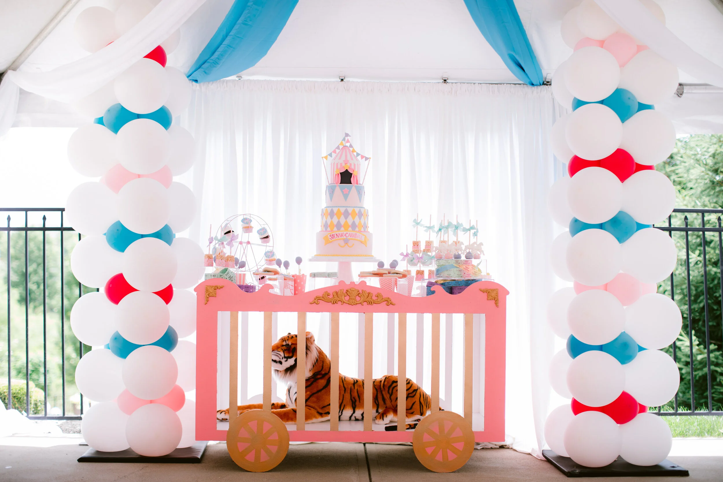 As soon as guests walked up to the driveway, they were greeted by a clown on stilts + got to play custom Carnival games such as Ring Toss, Balloon Pop, + Dunk a Duck. Then, after walking up to the custom Ticket Booth, they entered the balloon lined tent + made their way to the backyard, but not before grabbing a sweet treat off of the tiger caged dessert table. Once in the backyard, they grabbed a custom drink from the bar + hopped into the pool. It was a perfect summer party + SHE can’t wait to make more memories with this family!